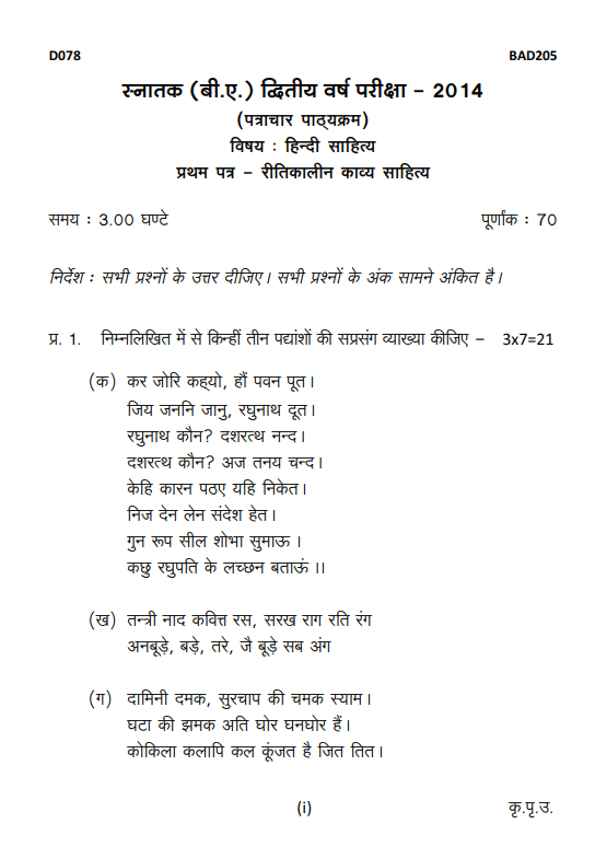 MLSU BA 2nd Year Hindi Literature Paper 2017