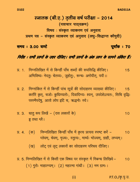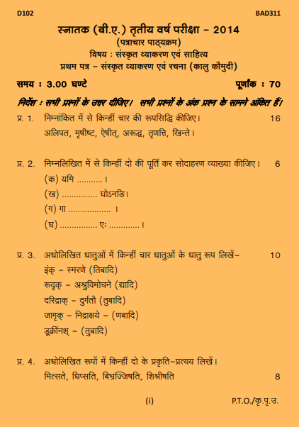 BA 3rd Year Sanskrit Literature Question Paper 2016