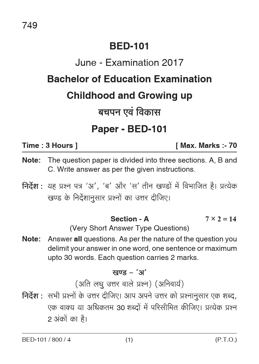 BED Childhood and Growing UP Question Paper PDF JUNE 2017
