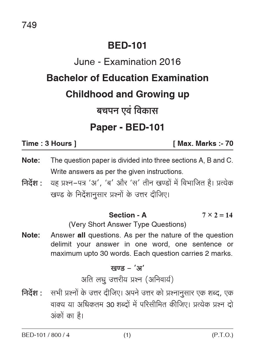 BED Childhood and Growing UP Question Paper PDF JUNE 2016