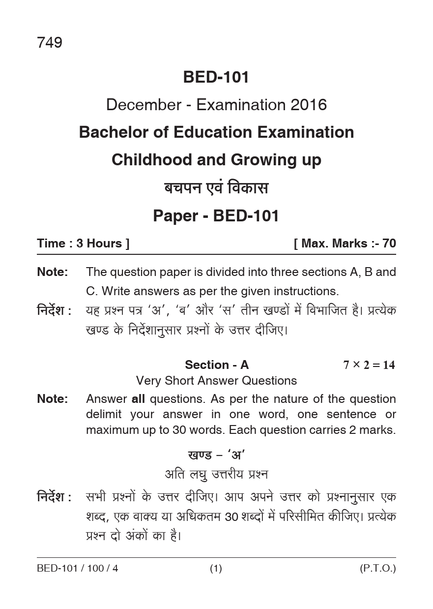BED Childhood and Growing UP Question Paper PDF DECEMBER 2016
