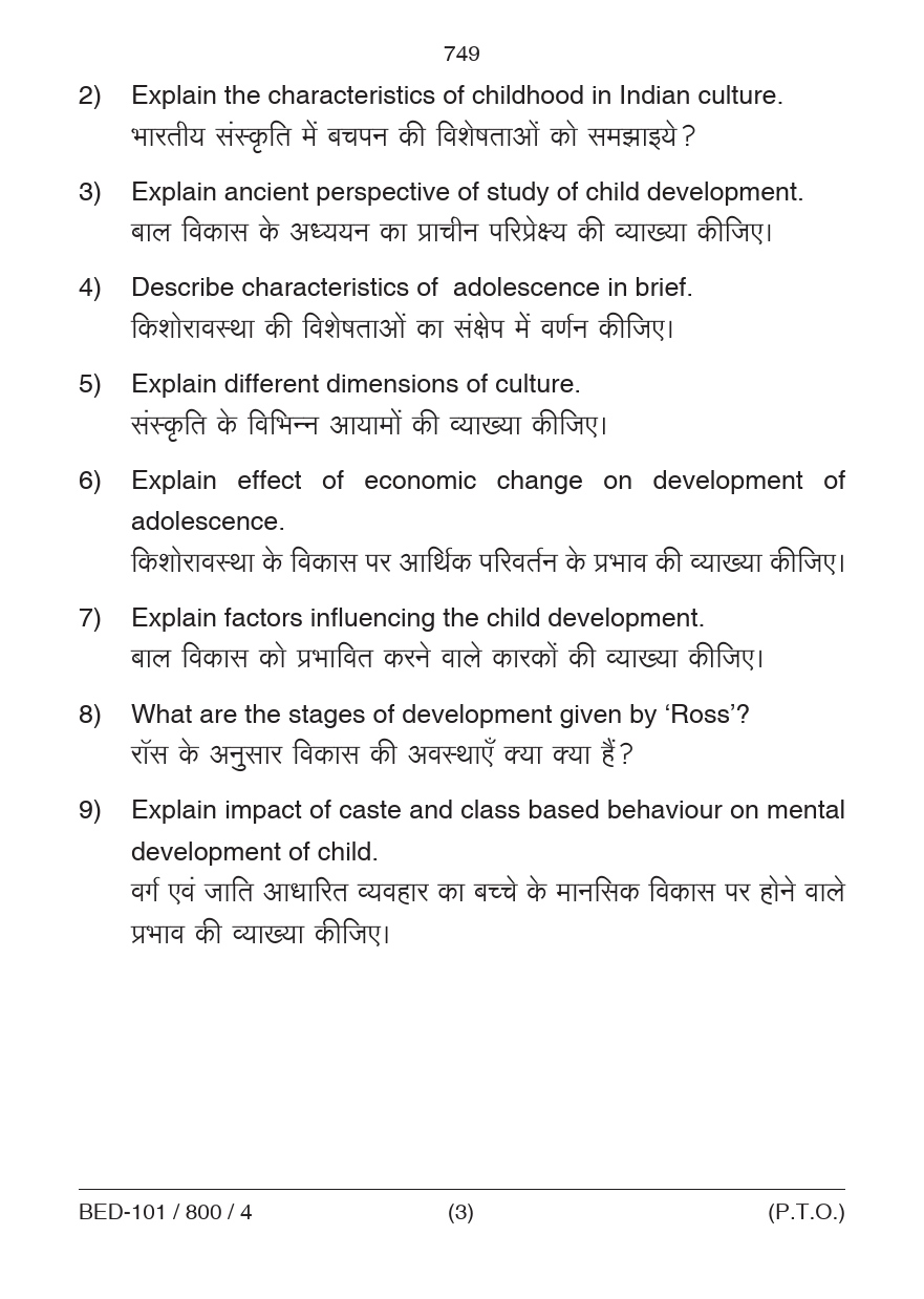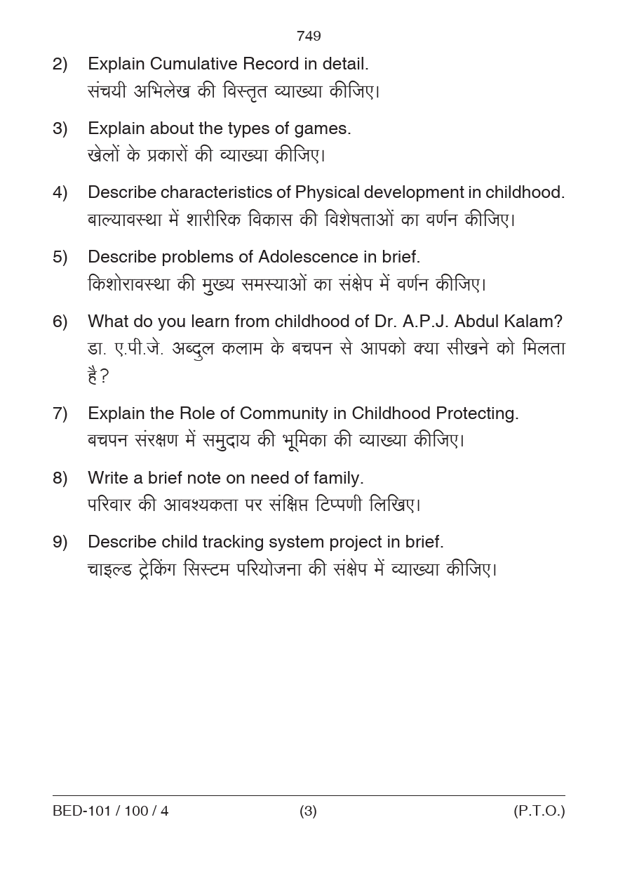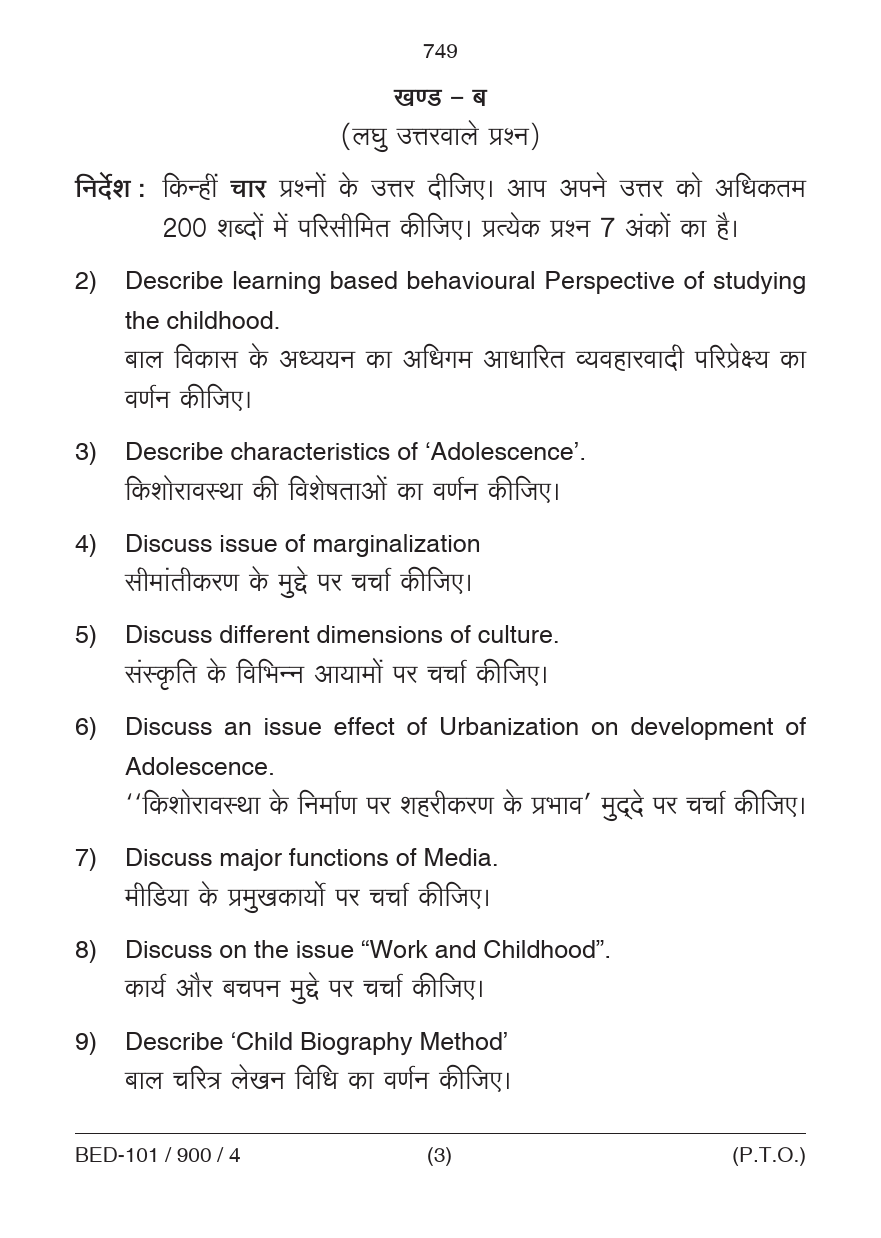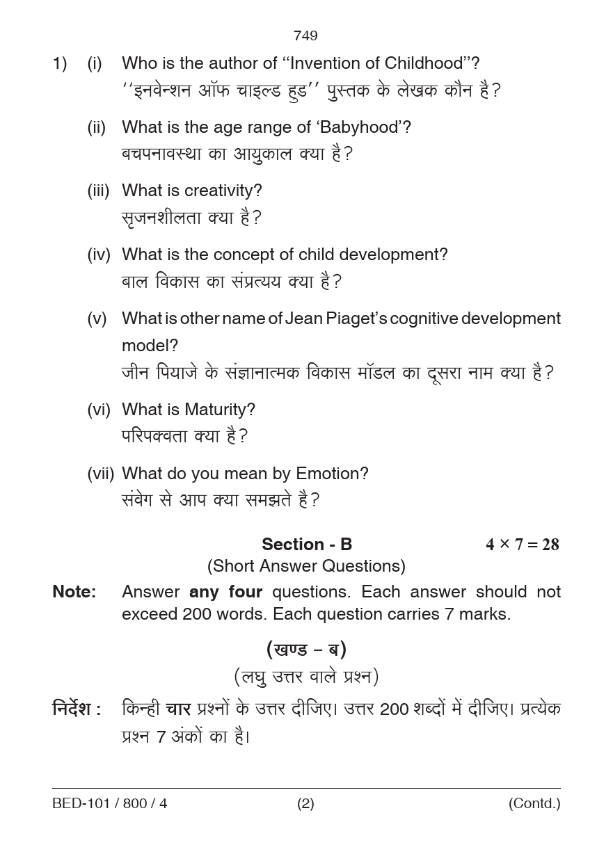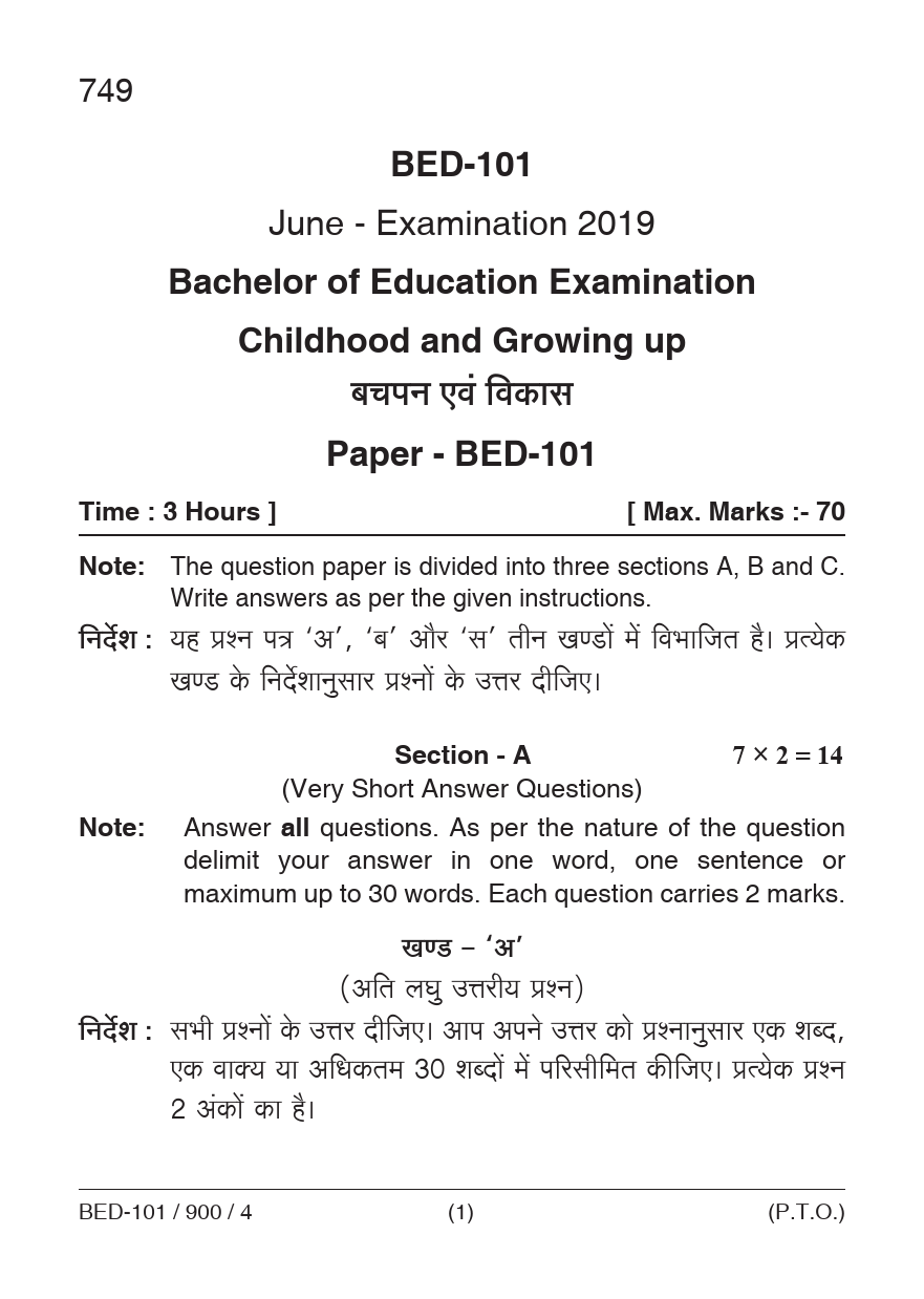 BED Childhood and Growing UP Question Paper PDF JUNE 2019