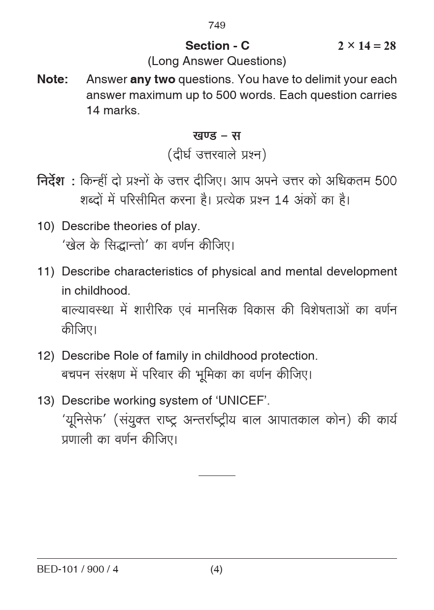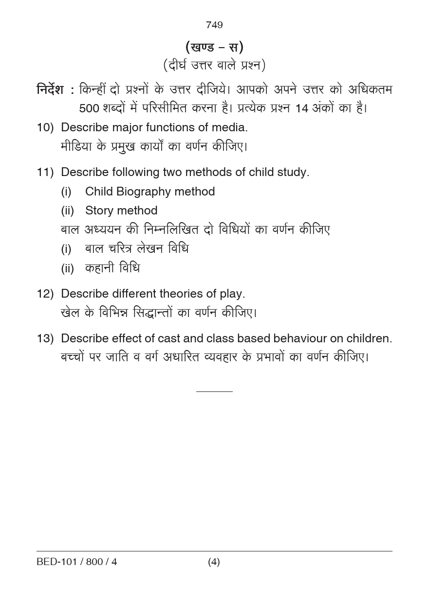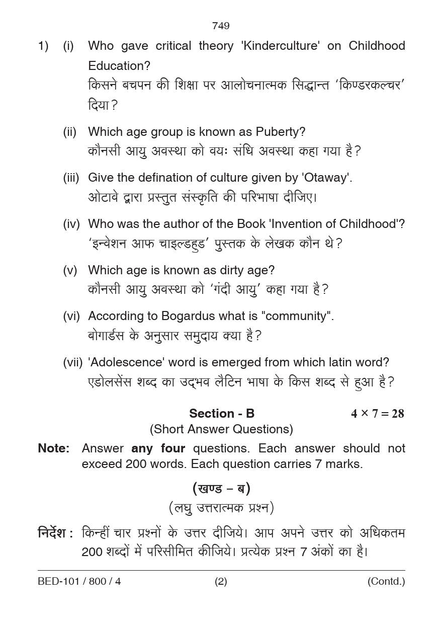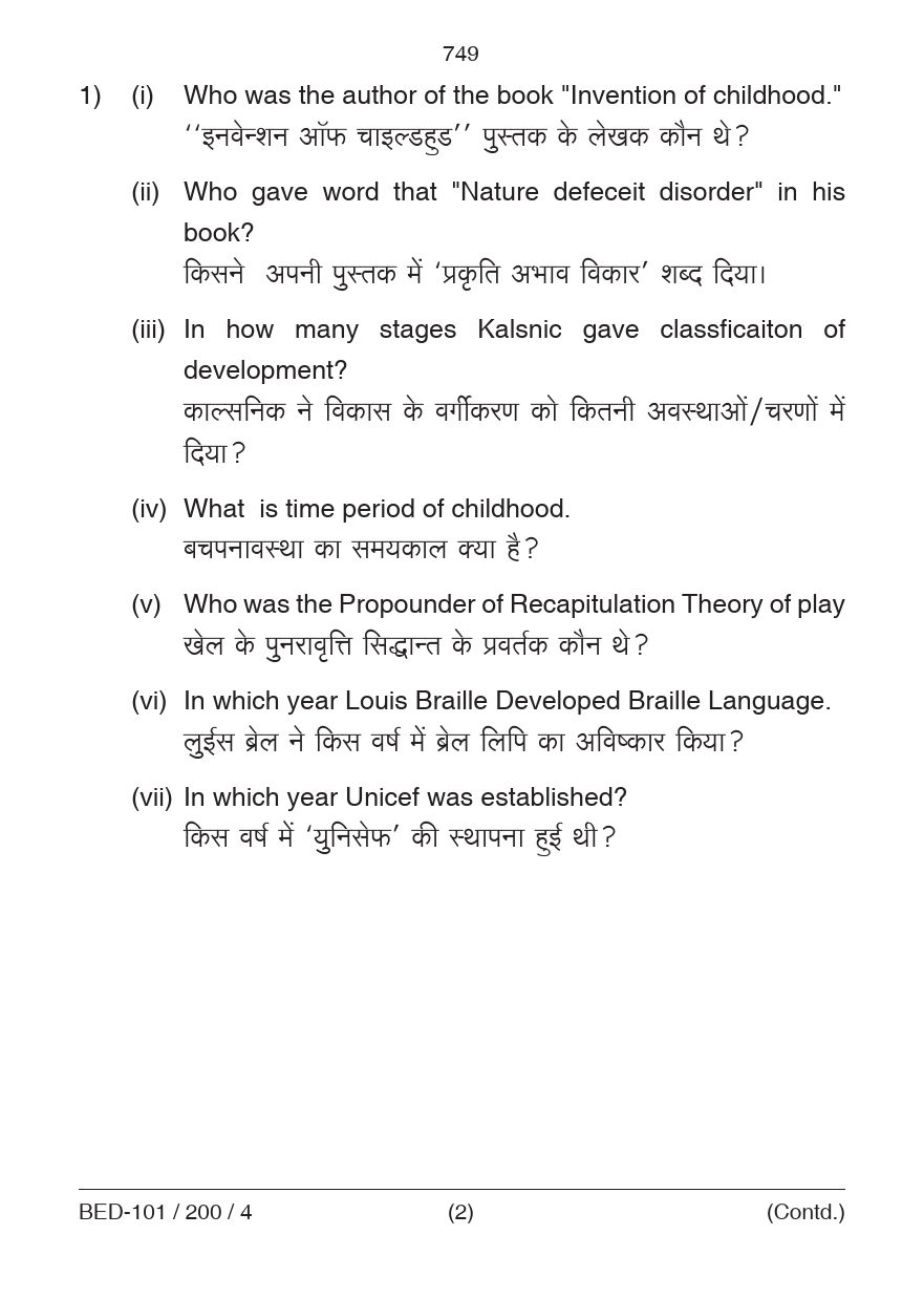 BED Childhood and Growing UP Question Paper PDF JUNE 2019