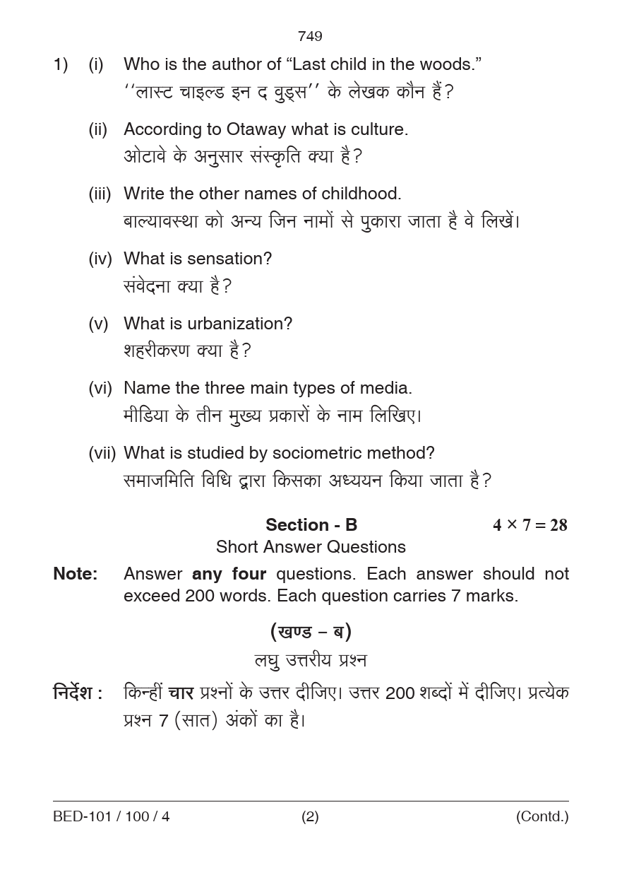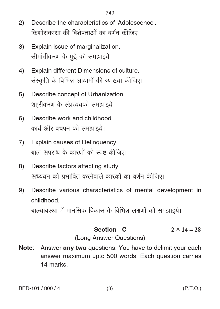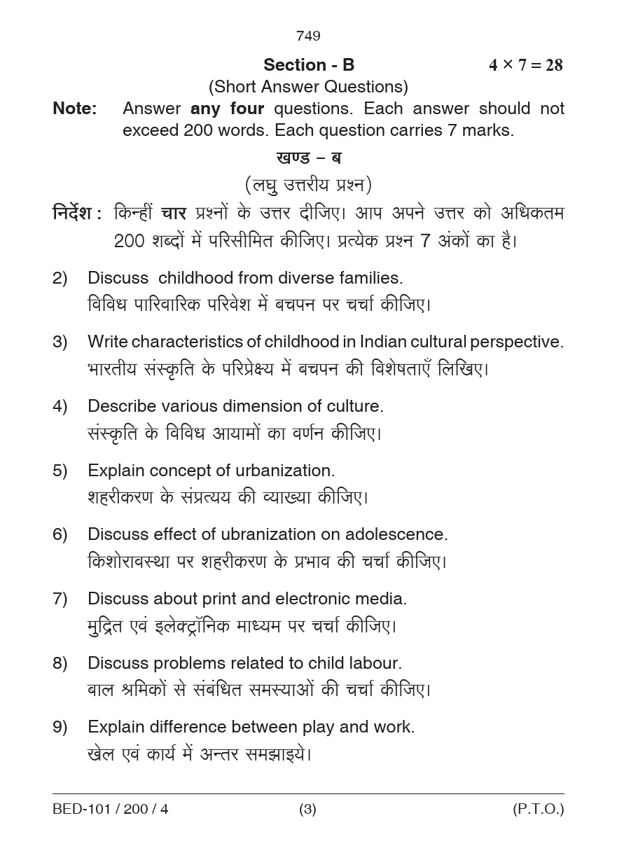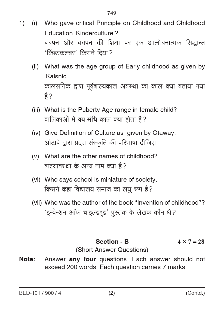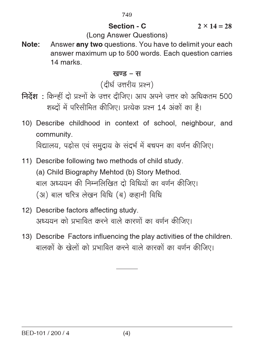 BED Childhood and Growing UP Question Paper PDF JUNE 2019