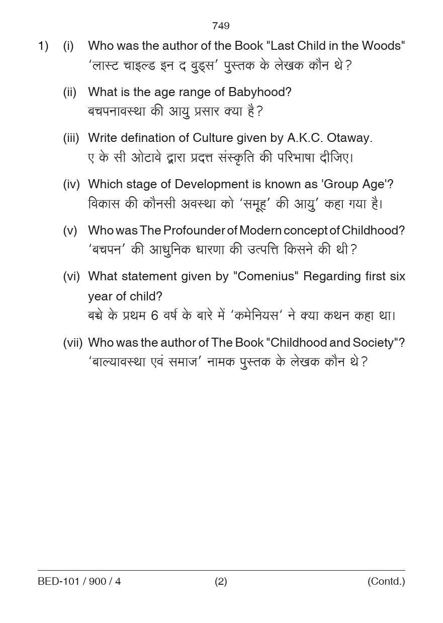 BED Childhood and Growing UP Question Paper 2023 PDF