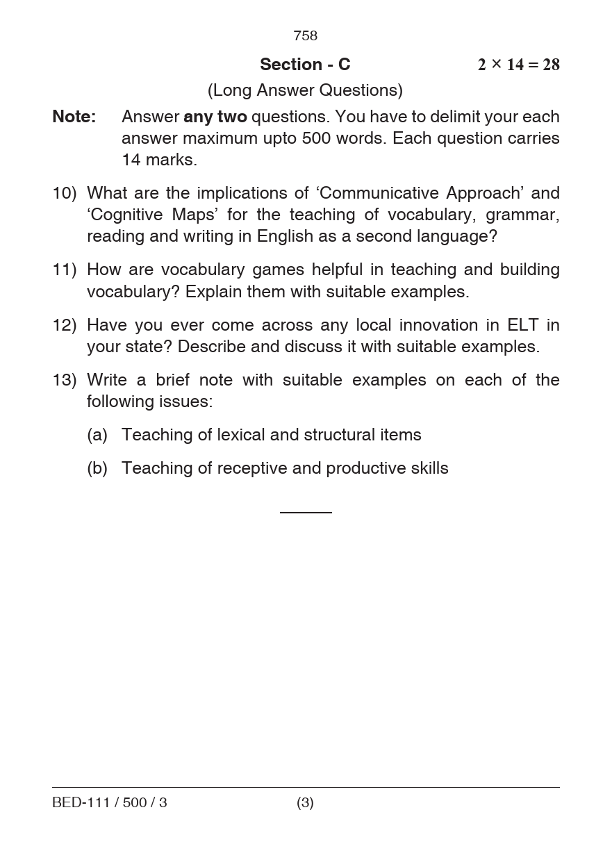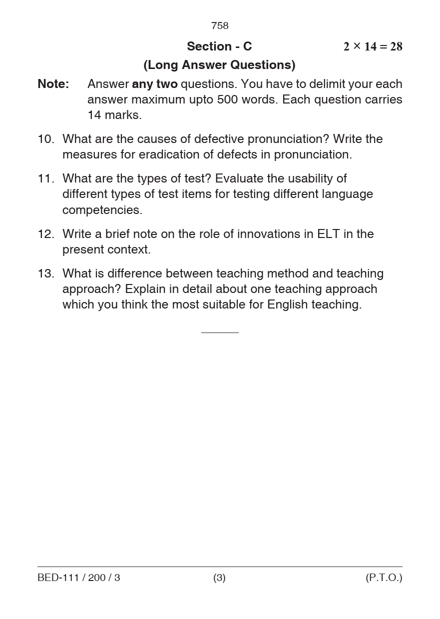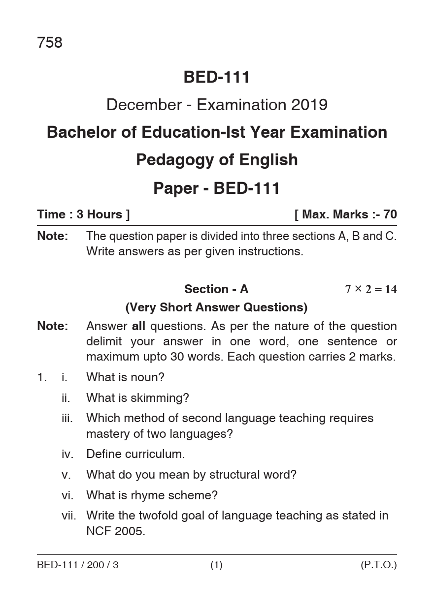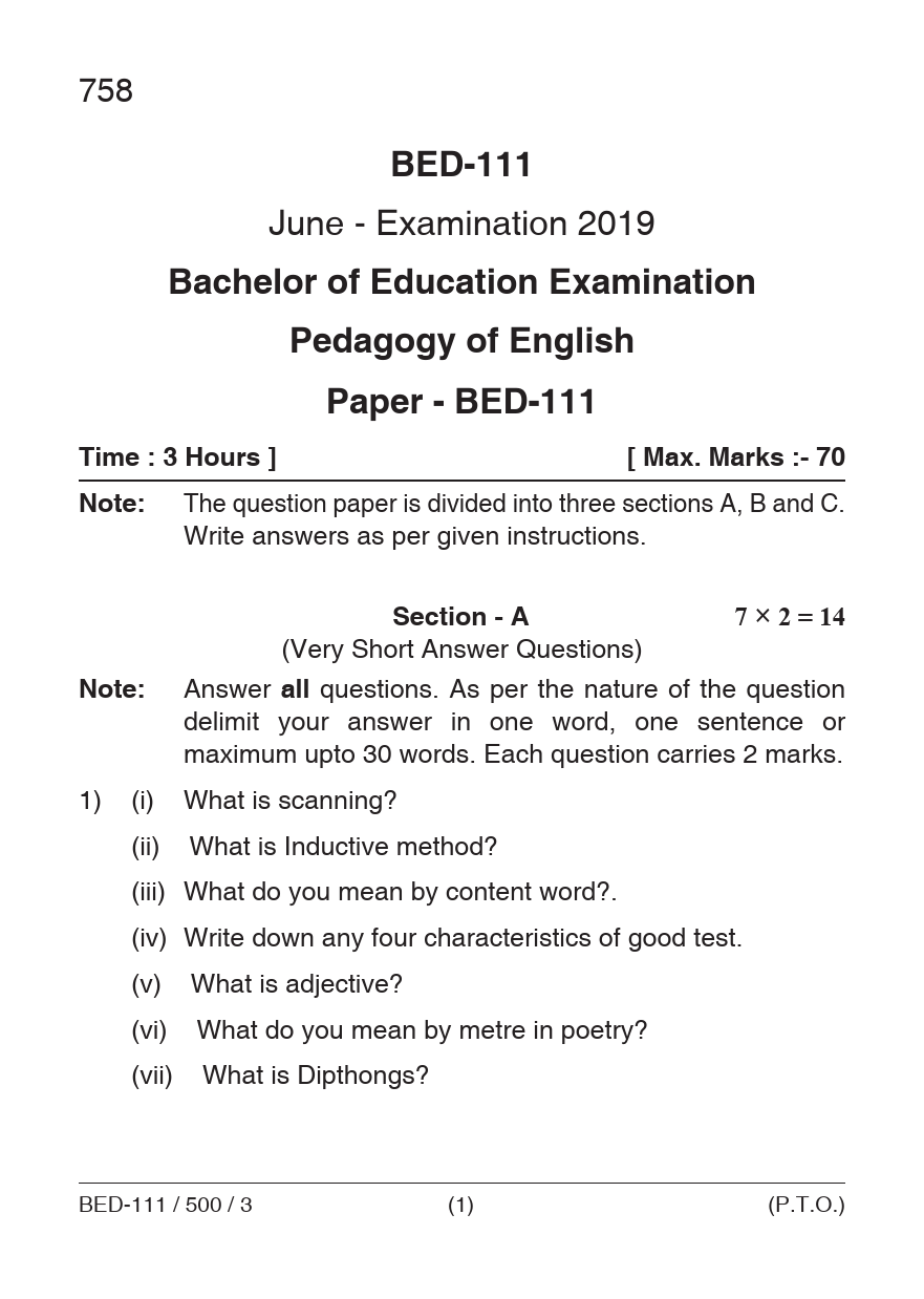 BED Pedagogy of English Question Paper PDF June 2019