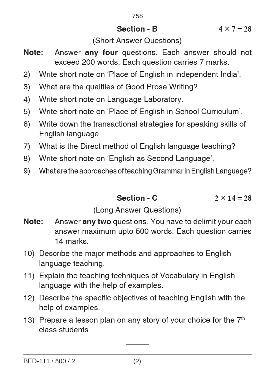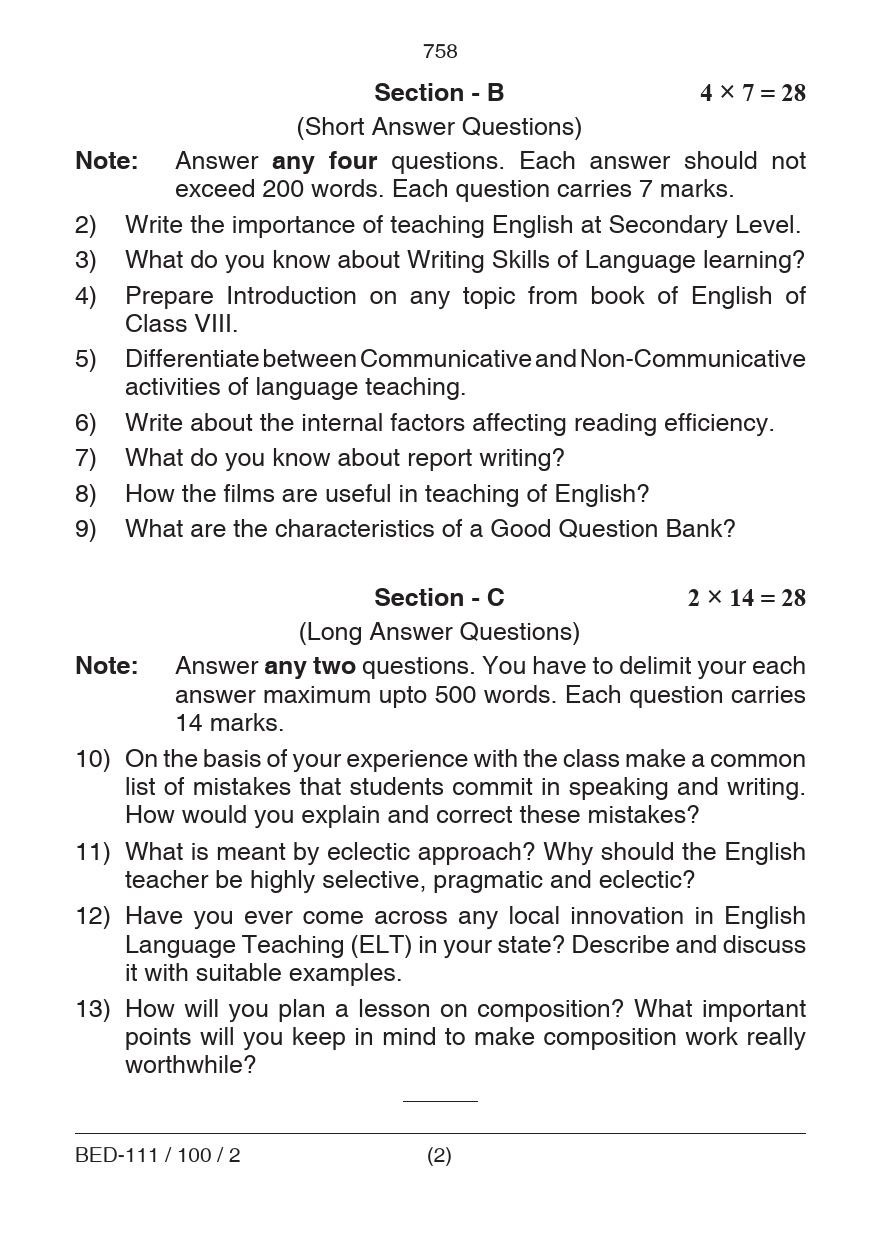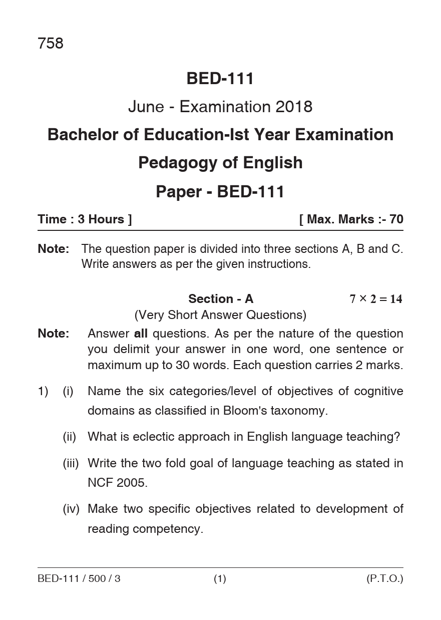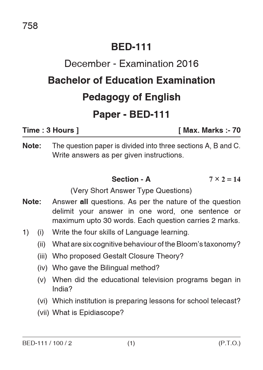 BED Pedagogy of English Question Paper PDF June 2018