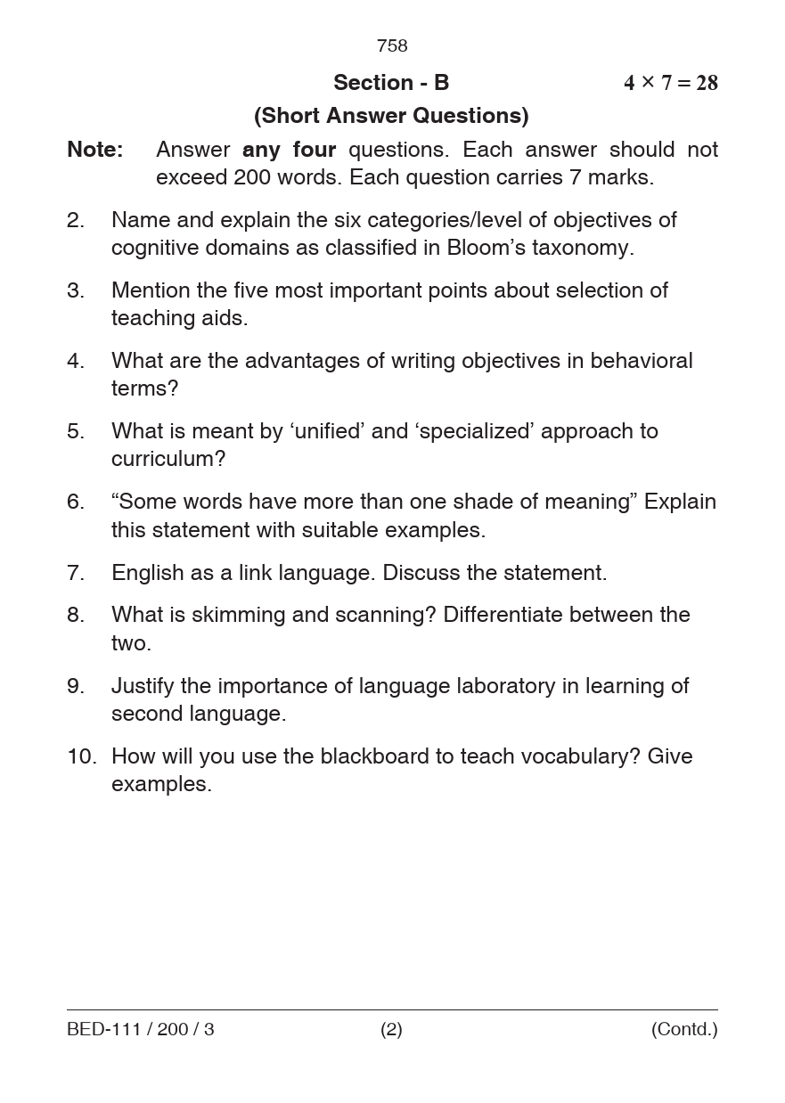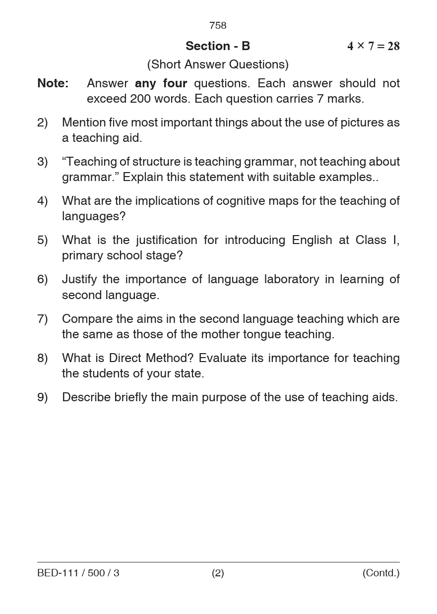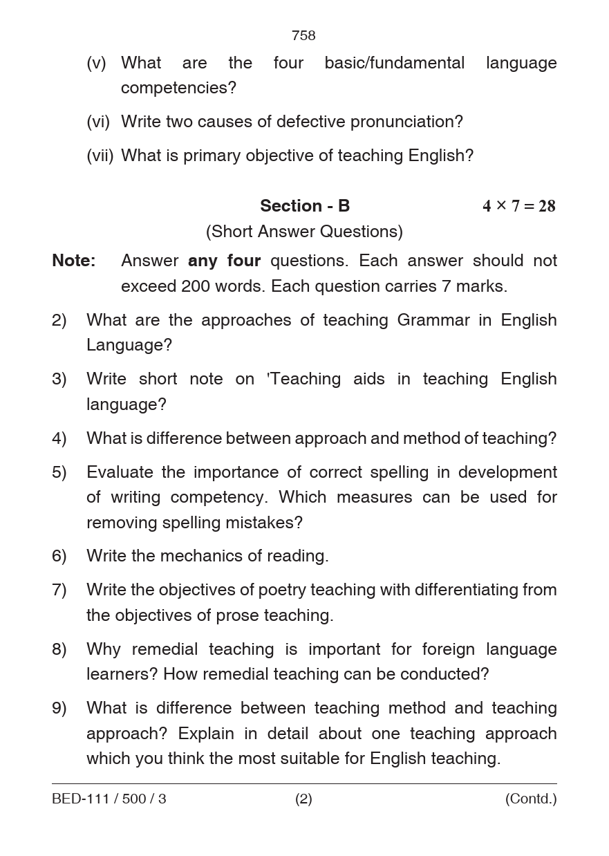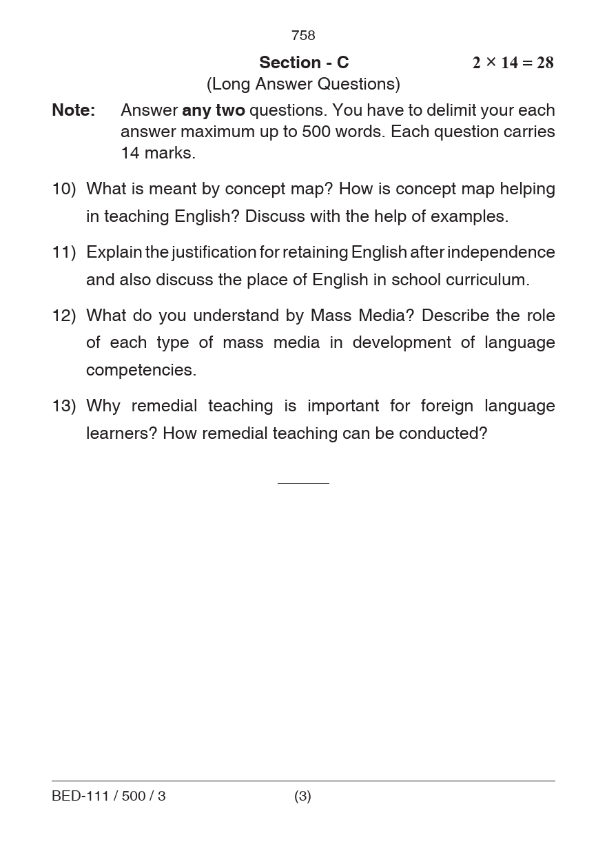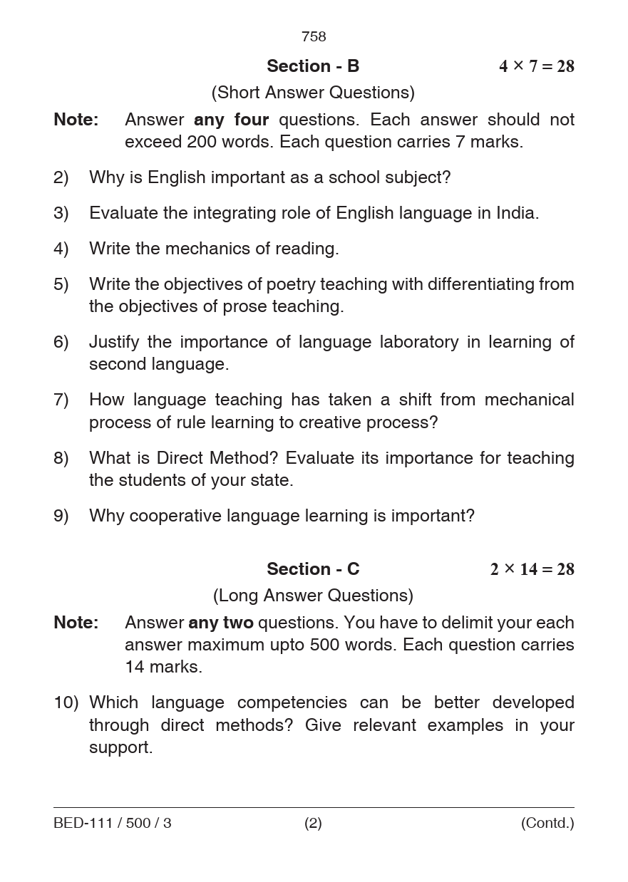 BED Pedagogy of English Question Paper PDF June 2018