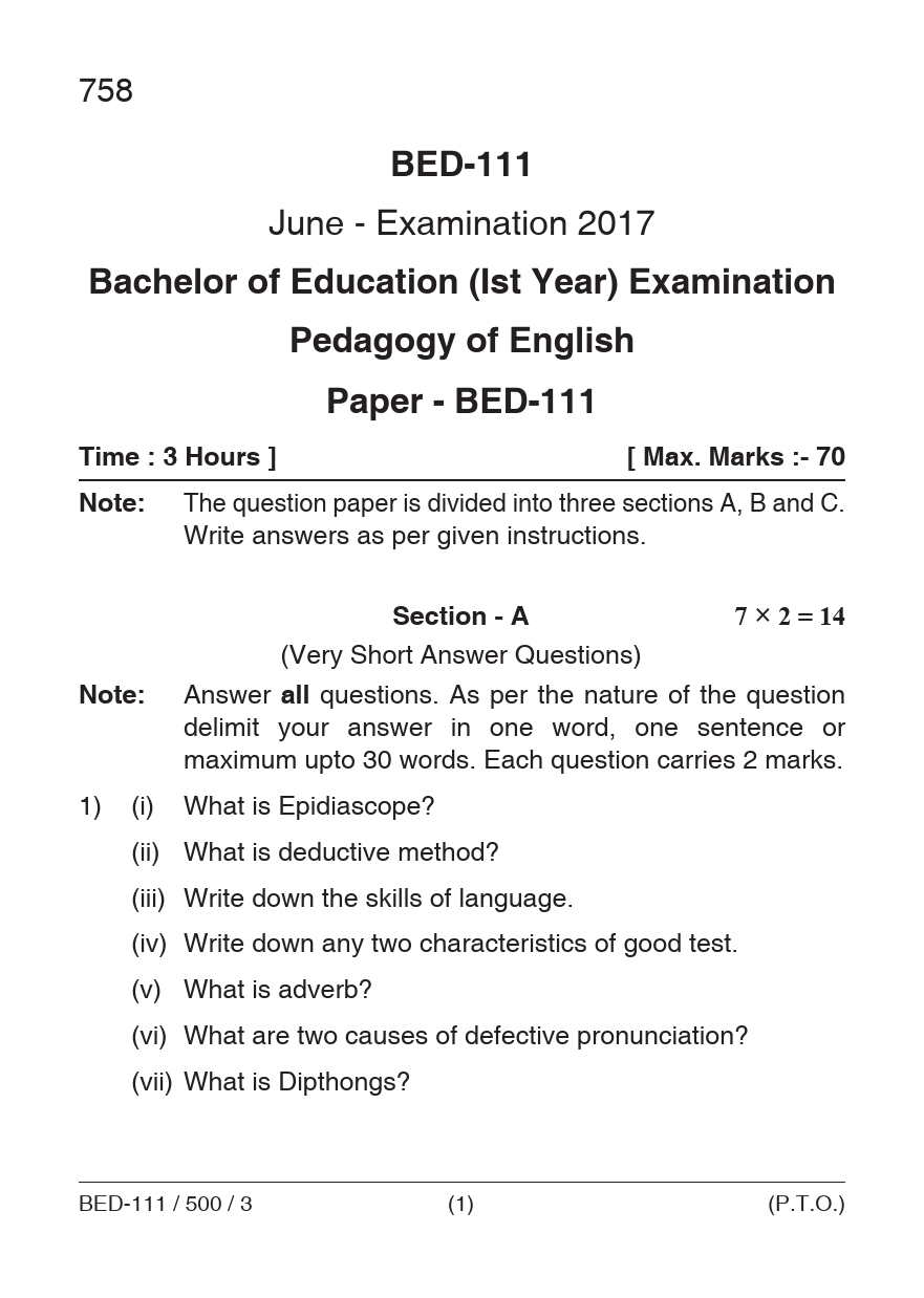BED Pedagogy of English Question Paper PDF June 2017