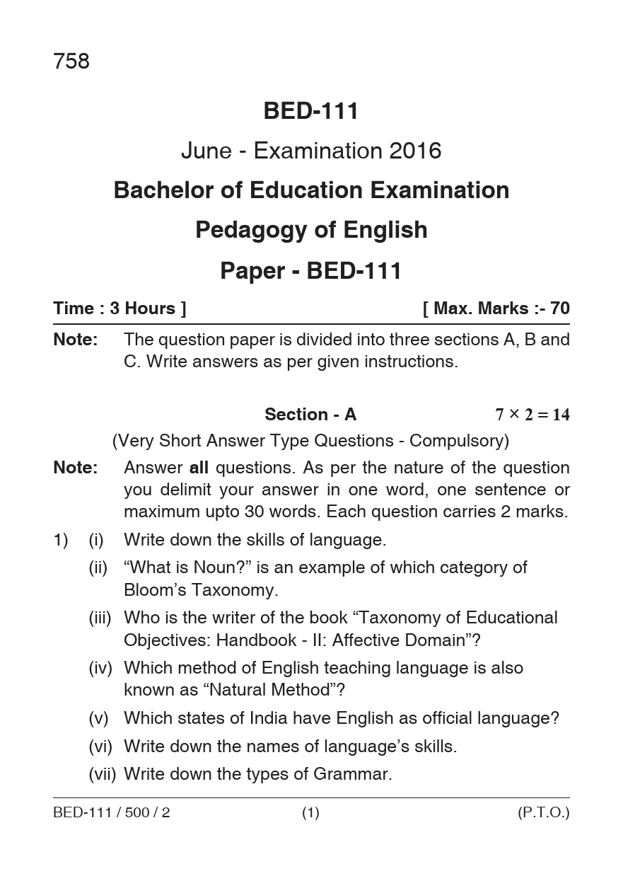 BED Pedagogy of English Question Paper PDF June 2016