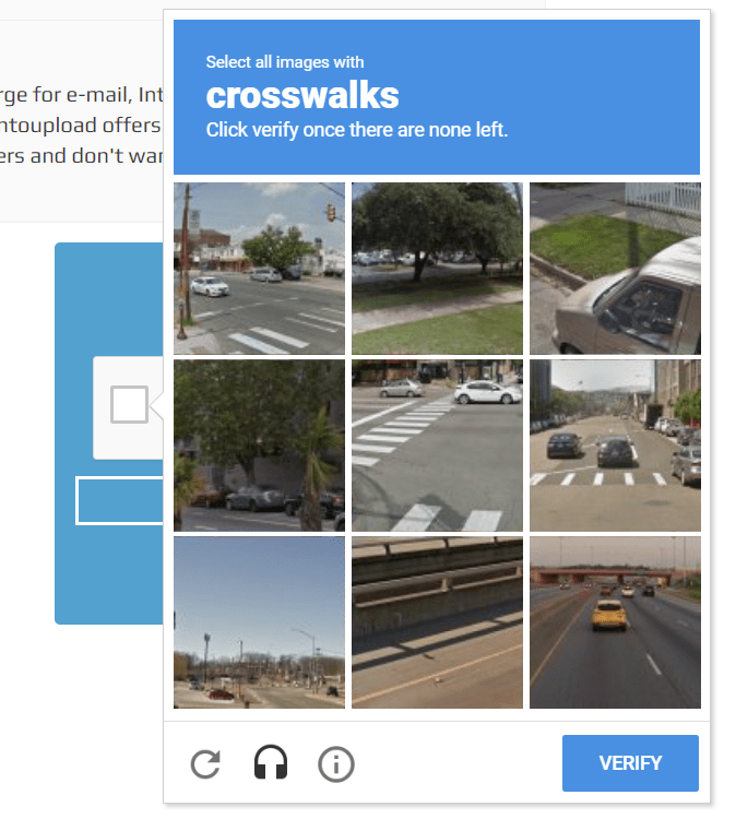 अब आपको I’m not a robot वाले box को टिक करना है | जैसे ही आप उसे टिक करेंगे आपके सामने एक captcha को वेरीफाई करने के लिए एक बड़ा box खुल जायेगा | जोकि आपको कुछ पिक्चर सेलेक्ट करने को बोलेगा | {जैसे इस उदहारण में Zebra Crossing वाले पिक्चर को सेलेक्ट करने कोई बोल रहा है}